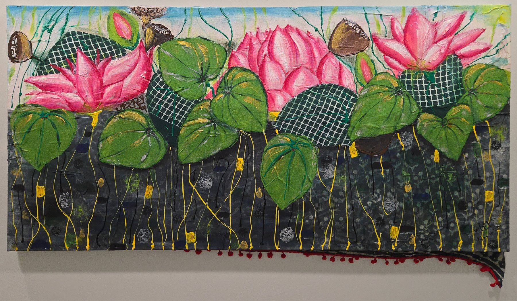 This piece represents the muck in which the lotus grows! The plentiful muck, represents the labor force giving the few lotuses – the successful few, the glory of success. The Artist cares to remember the work force with which our world grows and barely gets remembered, thought of, or appreciated. 40-44% of the USA’s work force is low paid.